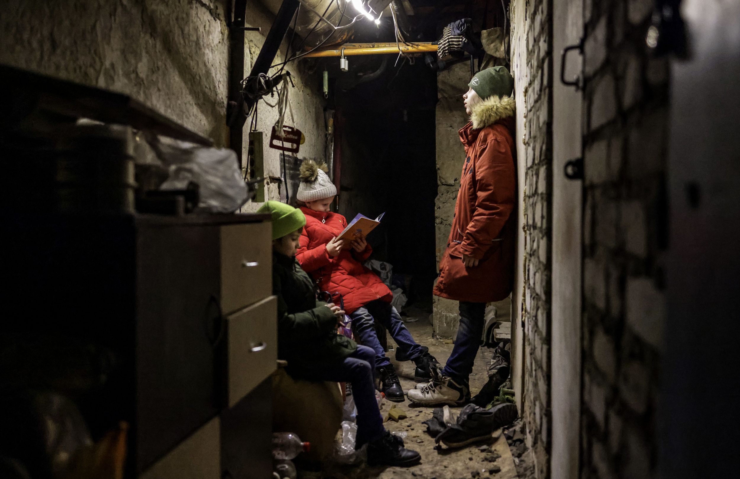 Gleb (8 years old), Myroslava (9 years old), and Danya (12 years old) in their storage basement in central Bakhmut. They are positive and open, despite the hell around them. All the homes in this area are destroyed. Explosions are heard every second both near to them and on the outskirts of the city. The constant explosions come from shells, mines, hailstones, cluster ammunition and rockets. Fight for Bakhmut now is one of the most bloody battle since the russian invasion. Bakhmut, 19 December 2022