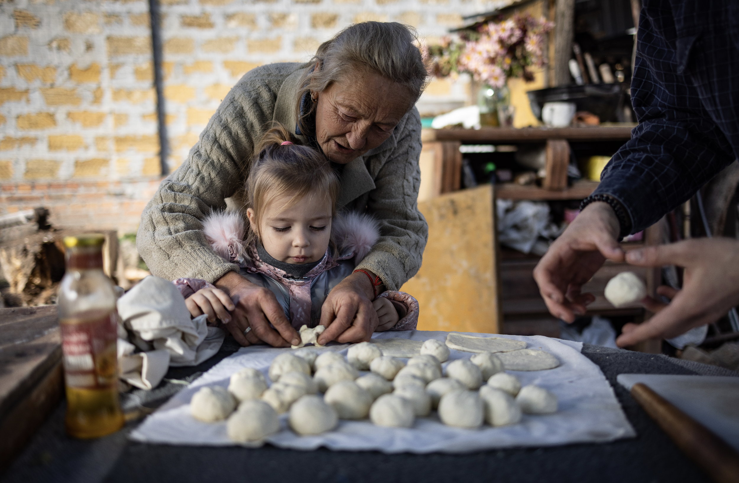 A group of volunteers has been cooking food for eight months and distributing it to locals on one of the streets in occupied Kherson. At the photo: 59 years old Tatiana Lukashchuk teach daughter of one of the volunteer how to made simple bread. Liberated Kherson, 14 November 2022