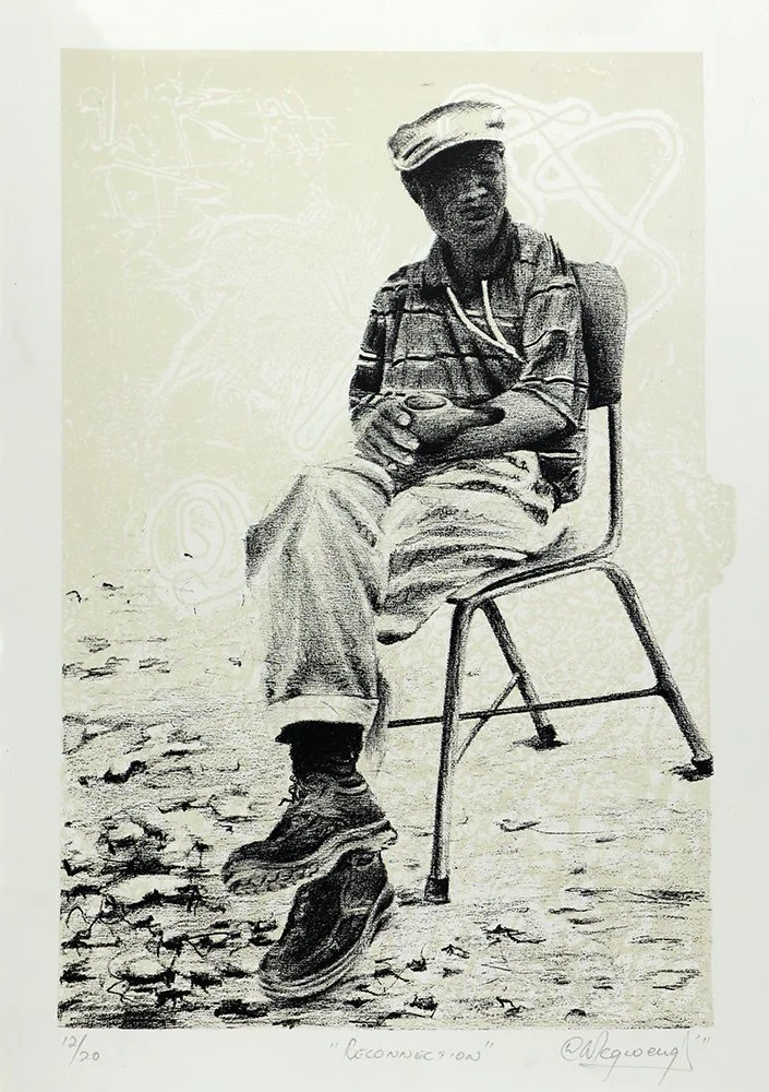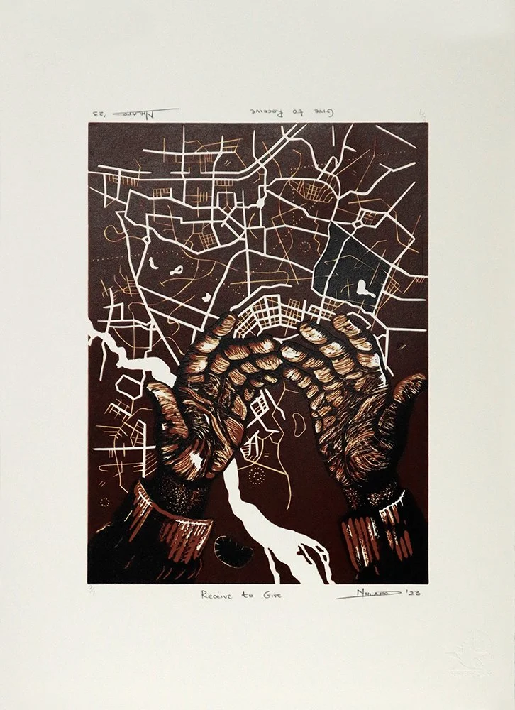 Hlelowenkosi Molefe, born in 1995 in Bulawayo, Zimbabwe, Molefe enrolled at Artist Proof Studio in 2015 and graduated in 2017. The next year, he began an internship at Artist Proof Studio in the Silk Screening Unit. Molefe works in different printmaking techniques like etching, linocut and screen printing. Molefe is currently working at Artist Proof Studio as a Silk Screening Technician. His latest body of work draws inspiration from conversations with various individuals, particularly friends and family, revolving around migration and changing geographic locations. These discussions on migration, focusing on issues of insecurity and the challenges of assimilation, resonated deeply with his personal experiences of moving from Zimbabwe to South Africa and exploring different provinces in his new home. To bring these themes to life, he uses the technique of etching - by allowing the plate to be exposed to acid for varying durations, he creates bold and strong tones in contrast, symbolizing how the longer one stays in a particular environment, the more profound their roots become. His work is a visual testament to the resilience and beauty that emerges when we embark on journeys to find our place in an ever-changing world.