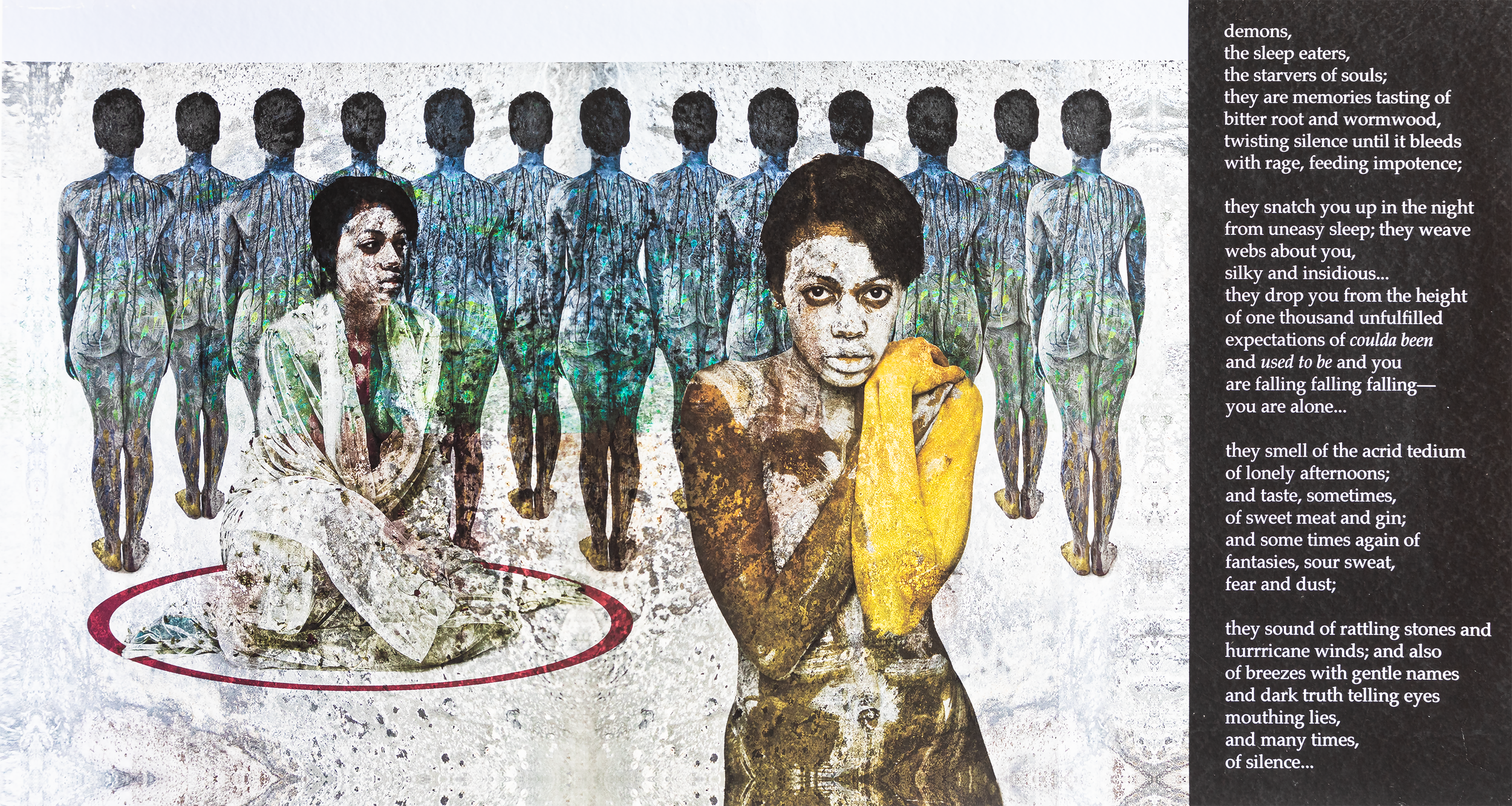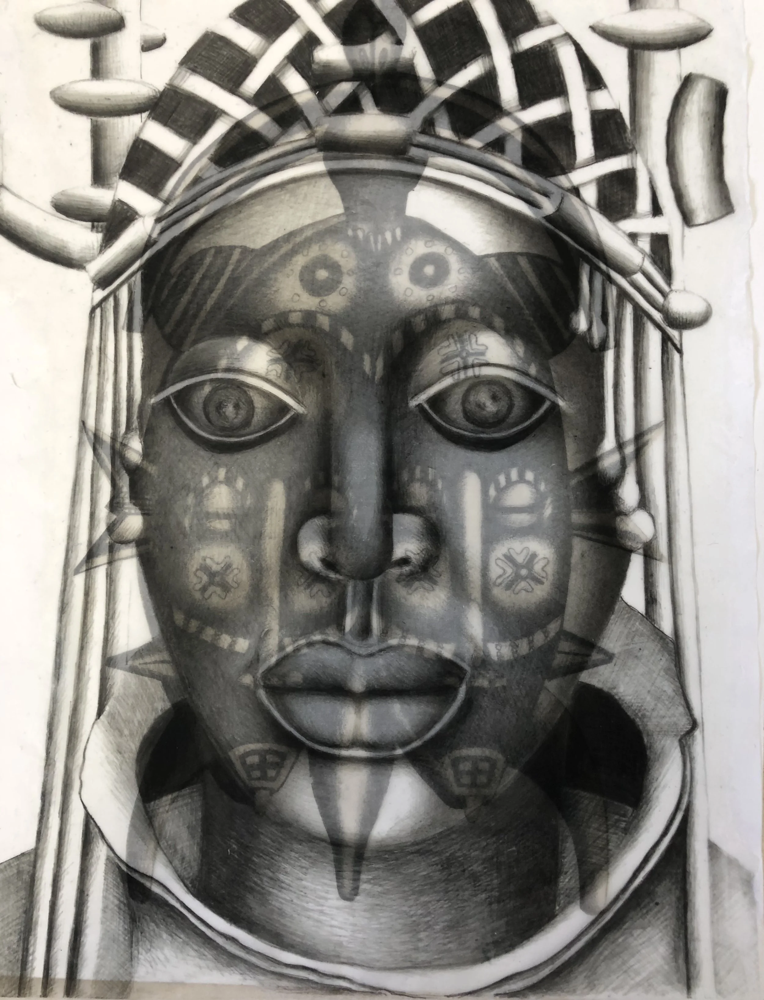 Shaw-Clemons superimposes multiple masks to create a ghostly mask providing transparencies of layers of the Black human condition. Drawing inspiration from masks she owns and those in the African Art Museums, Shaw-Clemons envisions them as representations of spirits of ancestor’s past, yet are also futuristic. To illustrate how the masks embody the spirit of her protective ancestors, Shaw-Clemons creates the transparent illusion, empowering her to create mysterious effects, while calling up the ancestors deep within.