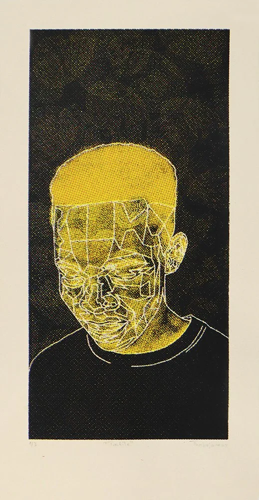 Thato Thobejane, born in 2001, was raised in Tembisa, South Africa but currently lives in Midrand, in central Gauteng. Thobejane specializes in a variety of mediums such as painting, printmaking, drawing, digital art and photography. In 2021, Thobejane joined the Artist Poof Studio in order to learn more about different techniques of printmaking. Thobejane is currently completing his third year at Artist Proof Studio. His work includes figures, portraits, and geometric shapes. The work titled “sense of touch” is based on his investigation of his identity as an African through finding an innovative and unique style. The artwork is born digitally by taking pictures of a human figure then manipulating the figures into geometric shapes and patterns. He then transfers the 3D digital drawing into a 2D print by experimenting with mediums of linocut and silkscreen. Thobejane primarily uses linocut as the detail of carving on the lino gave a good representation for the fingerprint used in the work. Within this body of work, Thobejane strives to capture the hidden, uncomfortable presence of the self. The gold background of the work is a metaphorical reference to the rich land of his nation. The background is not clean, representing how every state can have its flaws but can also remain firm and strong. The symbol of the fingerprint is a foundation for the creation of every detail in the work because the fingerprint gives a literal unique touch on the work.