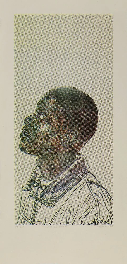 Bokang Mankoe, was born in 1992 in Tembisa, Johannesburg. He pursued his passion for printmaking at Artist Proof Studio, joining in 2013, where he honed his artistic skills and creativity. Following his graduation from APS, Bokang worked as an assistant printmaker for the renowned William Kentridge Horses series, contributing to the creation of Marcus Aurelius, Garibaldi, the Triumph of Bacchus, the Skeleton Horse, and Refugees prints. Taking his art beyond borders, Bokang was featured in a group show curated by Zea Mays Printmaking, held in Boston, MA, USA, in 2019 and various online shows. Currently, Mankoe serves as the Coordinator at the Professional Printing Workshop in APS, managing printing projects for fellow professional artists since 2022. His dedication and passion for art continue to drive his exploration of the concept of the "Perfect Man" and the exploration of masculinity in contemporary society. The passing of his father led him on a journey of introspection, seeking to understand and define what the ideal male figure would be for his younger brothers and sisters. Drawing inspiration from Leonardo da Vinci's depiction of the Golden Ratio face, characterized by its geometric lines, Mankoe utilizes his profile as a canvas to create an alter-ego, representing the unattainable perfection that exists in another dimension beyond reality. This concept finds expression through his multi-layered monotypes and linocut reductions. Mankoe deliberately uses unwanted paper and creates handmade paper, symbolizing the cycle of life.