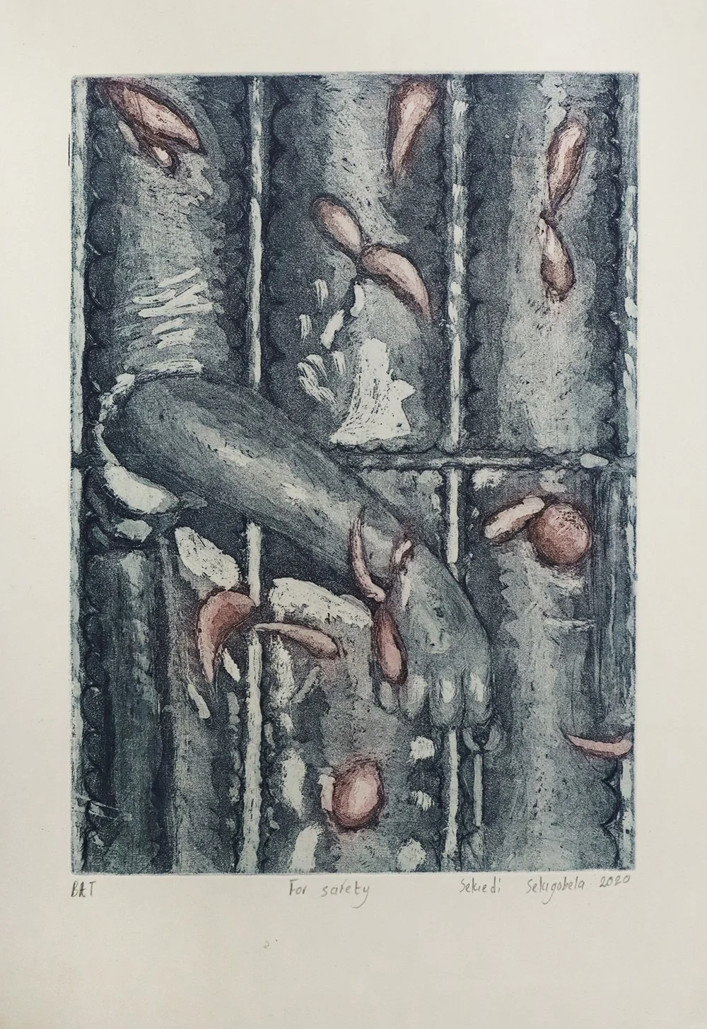 Sekedi Sekgobela, was born in 1997 in Limpopo province, and then raised in Tembisa. She is currently studying printmaking at Artist Proof Studio as a third year student. Her dream is to become a professional printmaker, visual artist and a business woman. Her work focuses on her resilience towards gender-based violence. She is motivated by the huge crime rate of abuse in South Africa, stemming from many personal experiences with victims of cruel abuse. She is inspired by roses and figures as symbols for strength, femininity, beauty and a ribbon of unity for women. This body of work talks about the healing process and protection needed by the victims and the depth of cruelty in the world promoting violence towards women and children.