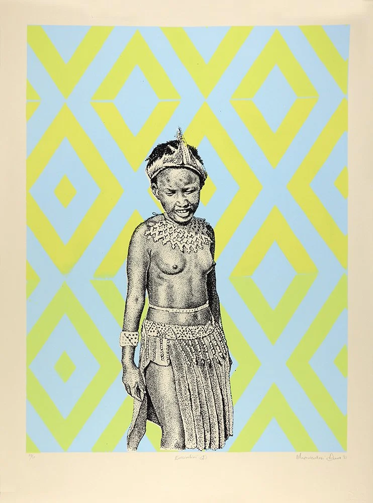 Musawenkosi Duma, was born in 1987, in Nongoma, in KwaZulu-Natal. He moved to Johannesburg in 2010 and is currently living in Daveyton. He studied drawing and printmaking at a local art center in 2013 before enrolling at the Artist Proof Studio in 2015. Duma currently specializes in the print medium of screen printing. His body of work pays tribute to his Zulu culture, specifically the role of women. The work documents a visual language of symbols and patterns specific to Zulu culture. This visual language is still used today as a form of communication in Zulu rituals and practices. His work testifies to Duma’s pride in the cultural traditions and practices that have informed his identity as a young Zulu man. He grew up in a community that participates in traditional Zulu rituals within a contemporary context. His prints are an attempt to preserve the Zulu culture that is under threat by Western values and globalization.