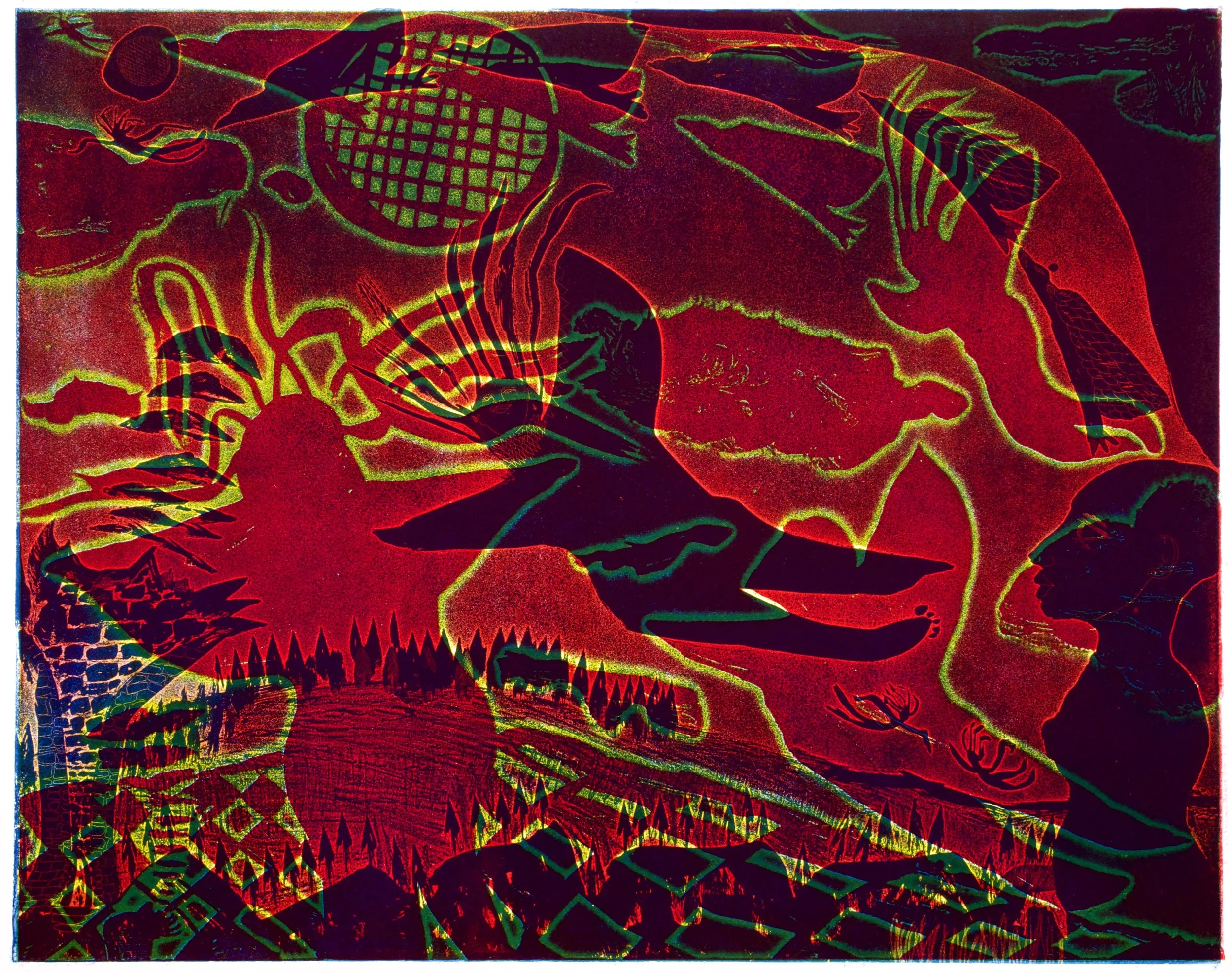 Monotype, or monoprinting, results in a one-of-a-kind, painterly piece. Paint is applied to a matrix, often metal or plastic, and then transferred to paper. Because of the variability of the paint, prints of the same design will differ.