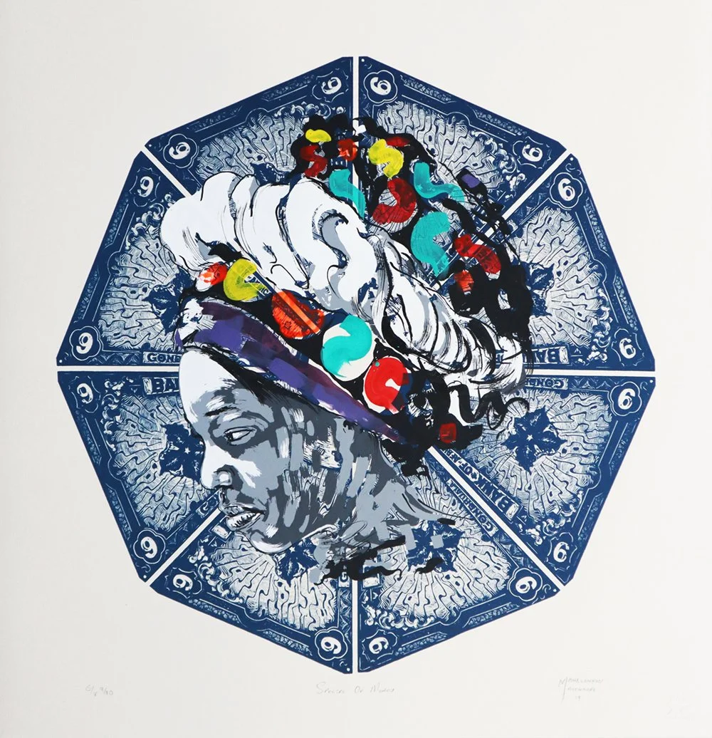 Mandlenkosi Mavengere, (b. 1992) was born in Zimbabwe, in the city of Bulawayo (known as city of kings). Mavengere works predominantly in printing and painting. He moved to South Africa after high school and it was in South Africa where he took up art as a career and got enrolled at Artist Proof Studio. He completed an internship at Artist Proof Studio and William Kentridge’s Studio and currently works as an independent artist from his own studio. His artworks are meant to bring the issues of contemporary migration into conversation and discussion. He migrated from Zimbabwe to South Africa because of economic pressures. His works are printed banknotes that consist of images talking about his journey from Zimbabwe to South Africa. They speak to his identity as a migrant staying in South Africa, and also the hostile economic politics that he observes. Mavengere emphasizes money being the cause of migration through the use of the etching technique. The artworks are a comparison of his country of origin and his new homeland.