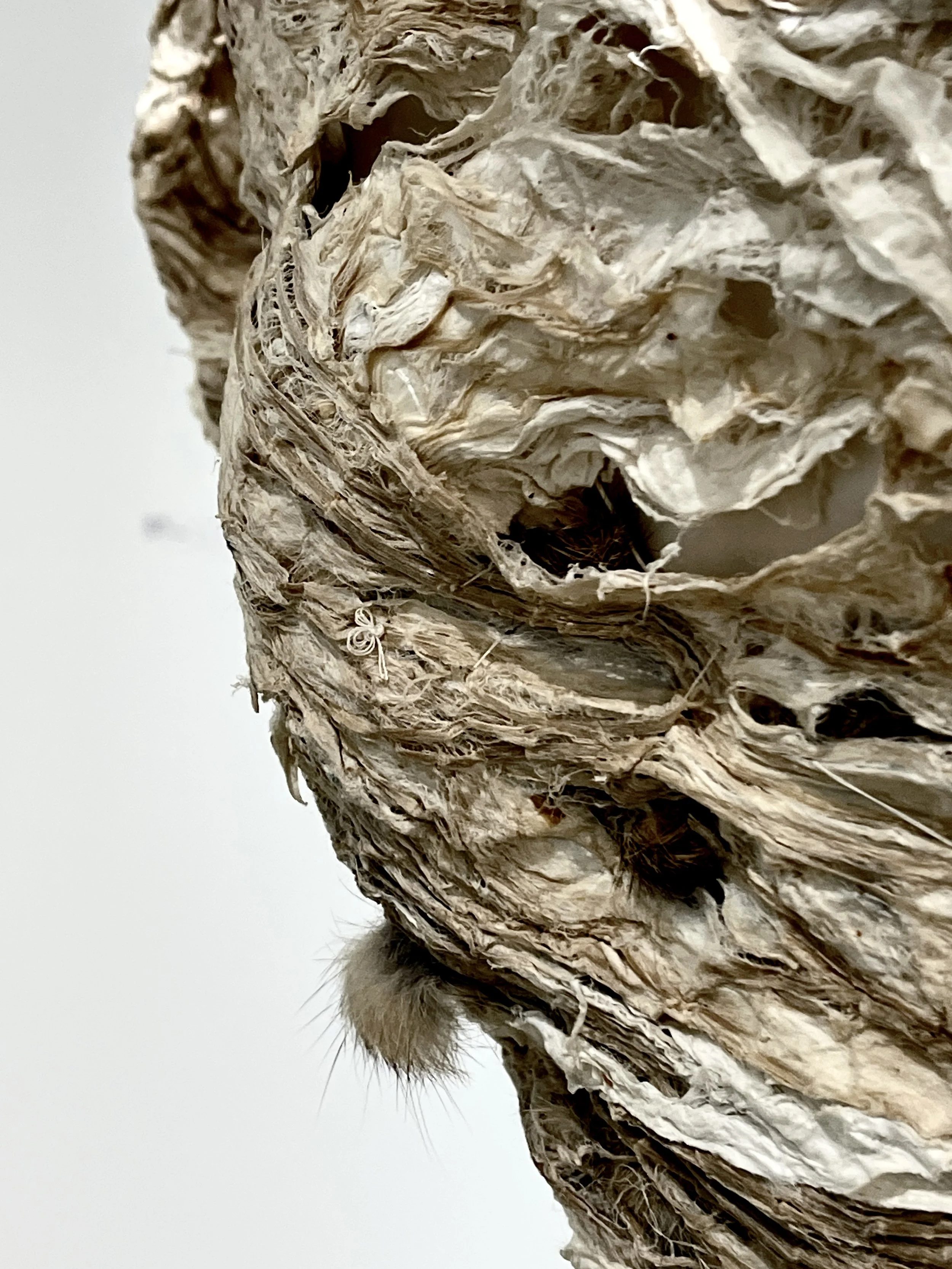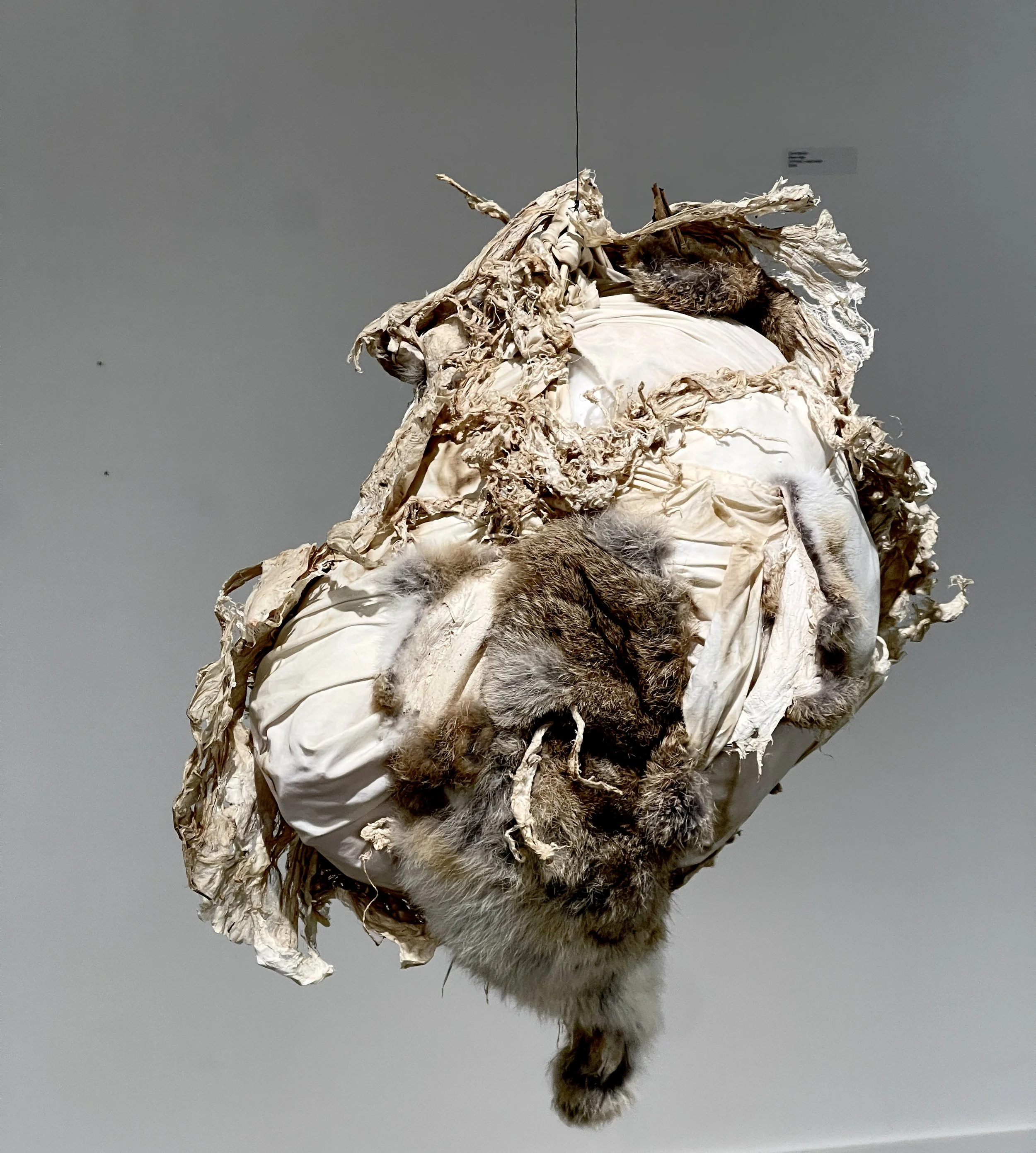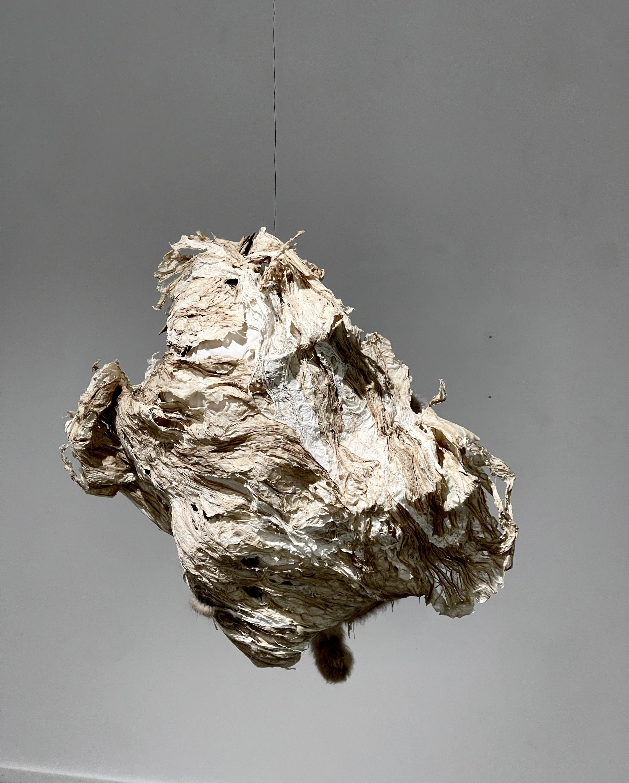 My primary materials are organic ephemera – plant and animal materials, without synthetics or technology. Most works exhibit as installations, often are suspended, and show indoors and out. In cases of outdoor installation, the materials are left outdoors to wear away over time back to where they came from.