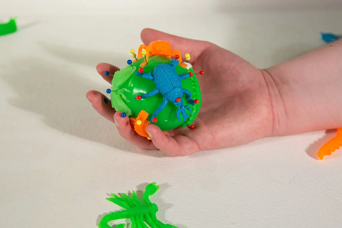 My work intersects topics of intellectual ability/neurodiversity and resistance to social standards and conformity, while celebrating our shared human experiences. It also acknowledges the infantilization of Millennials and Generation Z at the hands of the economic crisis that has disallowed young adult independence for most of the working class. The aesthetics in my work are inspired by 1990s and early 2000s subjects, such as sticky hands and plastic toys, and combine bright and muted colors that evoke nostalgic imagery. I describe my work as a Google Images page of squishy toy stock photos.
