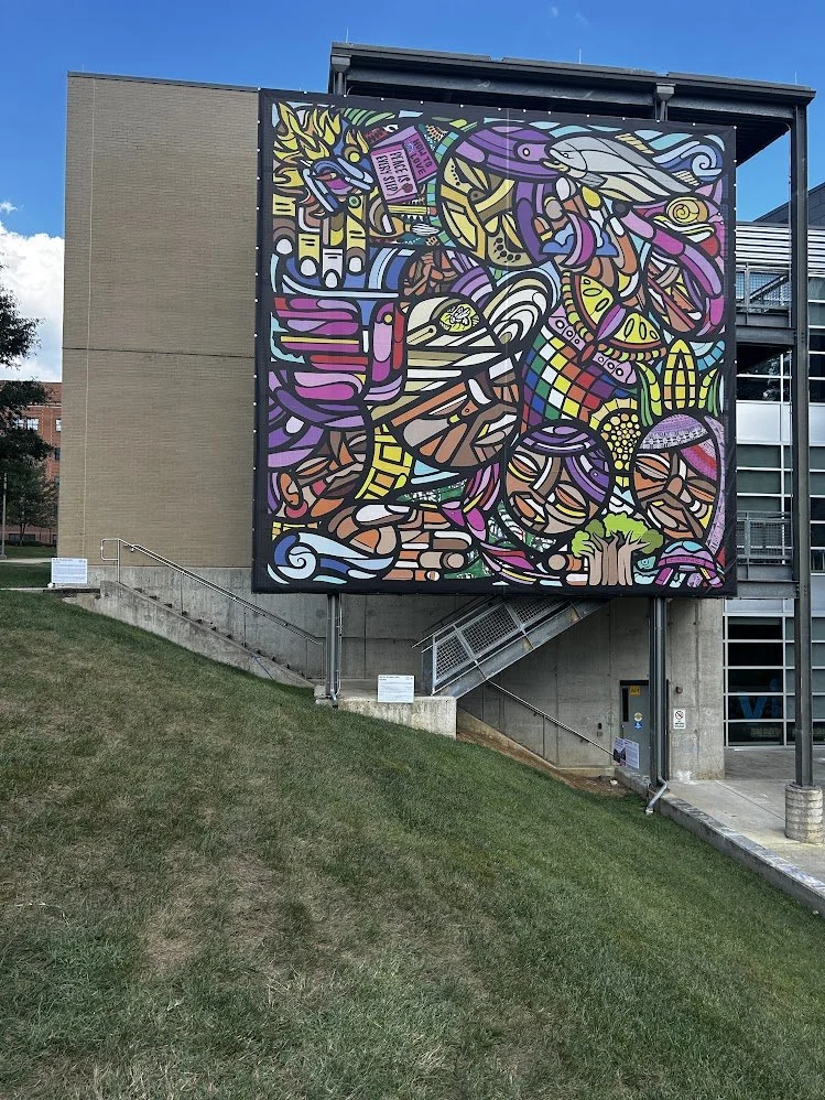 Murals at Mason commissioned a tapestry mural from School of Art alumnus (‘05), Federico “MasPaz” Frum that conveys interconnectedness and reciprocity between humans, animals, and the natural world. The group of people represent the global origins of the Mason student community. They are embracing each other and are surrounded by a variety of patterns that reference animals, plants, and symbols of learning and creativity.